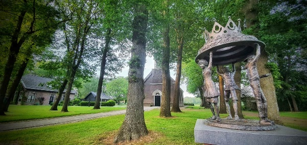 Het kerkje in Willemsoord waar kolonisten vroeger verplicht heen moesten om ‘zeden’ te leren, met op de voorgrond het mooie monumentje van 200 jaar kolonie